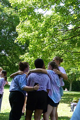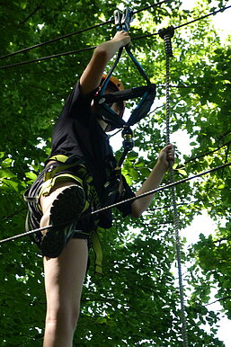 An diesem Tag steht unser Ausflug an. Es geht in den Klettergarten nach Weinsberg. Zum Glück ist es dort schattig, denn schnell wird es ganz schön heiß. Die allermeisten lassen sich davon nicht abhalten, durch die Parcours zu klettern. Die Teenies, die lieber nicht klettern wollen, können unten Spiele spielen oder Freundschaftsbändchen knüpfen.