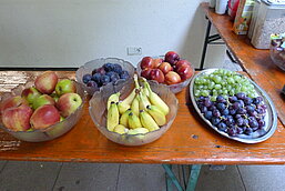 Unterbrochen wird die Gottesdienstvorbereitung nur durch ein Mittagessen. Die Küche hat Maultaschen gekocht, dazu gibt es Kartoffelsalat. Am Nachmittag gibt es außerdem Kuchen, bei dem alle kräftig zugreifen.