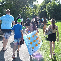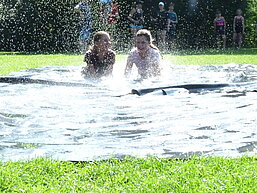 Danach wird die Wasserrutsche freigegeben. Viele Teenies nutzen die Gelegenheit, zu schauen, wie weit sie rutschen können. Andere bewerfen sich weiter mit nassen Bällen. Da bleibt kein Kleidungsstück trocken!