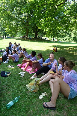 Das Wetter ist super, deshalb geht es noch einmal an den See. Die Badehosen, Bikinis und Handtücher sind zwar schon eingepackt, aber im Schatten lässt es sich aushalten. Wir knüpfen die letzten Freundschaftsbändchen, spielen Spiele und verewigen uns auf mit Unterschriften auf unseren Camp-Shirts.