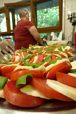 Als das Küchenteam zu Saitenwürstle, Gemüsepuffer und Tomate/Mozarella rief, hatten wir uns schon zusammengefunden.