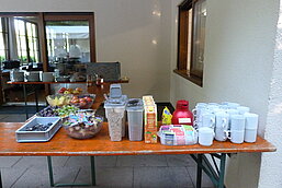 Zum Abendessen werden Reste verwertet. Dass das auch richtig lecker sein kann, beweist unser Küchenteam: Es gibt Maultaschen, Saitenwürste, Wurstsalat, Tomate/Mozarella, Burger, Spaghetti- und Couscoussalat. Da findet wirklich jeder etwas und alle werden satt. Besonders freuen wir uns über das Eis, das unsere Gäste uns mitgebracht haben.