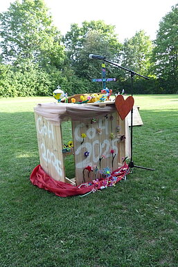 Zuvor wird aber vorbereitet. Wir teilen uns in Gruppen auf und direkt nach Frühstück und Teen Time geht es los. Der Altar und ein Kreuz werden gebaut, Blumen, Opferkasten und Abendmahlskelche gebastelt, ein paar Teenies proben ein Anspiel und eine Lesung, andere schmücken die Tribüne. Die Solisten und Musiker üben noch einmal die Stücke für den Gottesdienst.